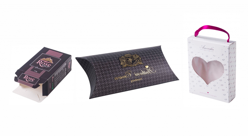 Ensin kartonki tulostetaan, sen jälkeen se leikataan rei’itettyjä linjoja pitkin ja sitten pakkauksen osat liimataan yhteen.