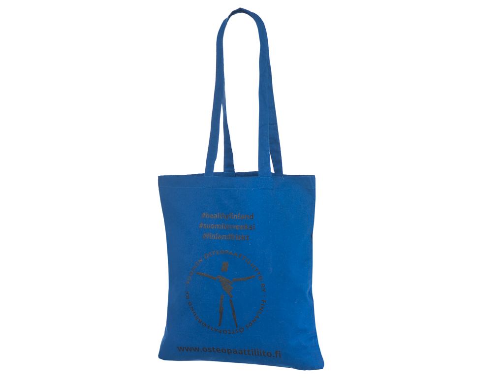 Kestävä ja vahva sininen puuvillakassi.Minimitilausmäärä omalla painatuksella on 50 kappaletta. Kuljetus Suomeen ilman lisämaksua.
