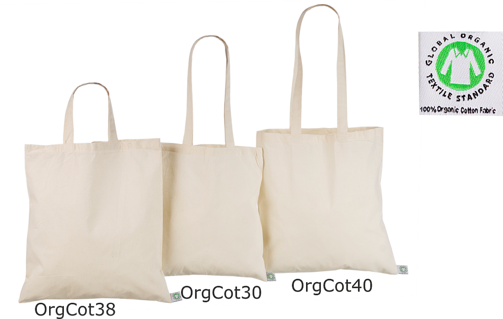 Våra naturfärgade ekologiska tygkassar, som tillverkas i 140 g/m2-bomull, finns i tre storlekar:
