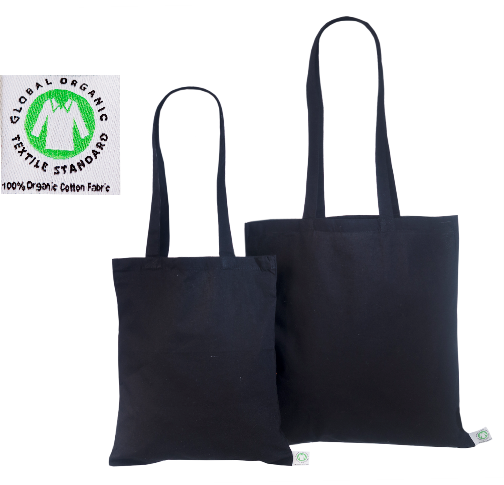 Du kan köpa våra svarta ekologiska tygkassar av 140 g/m2-bomull i två olika mått: